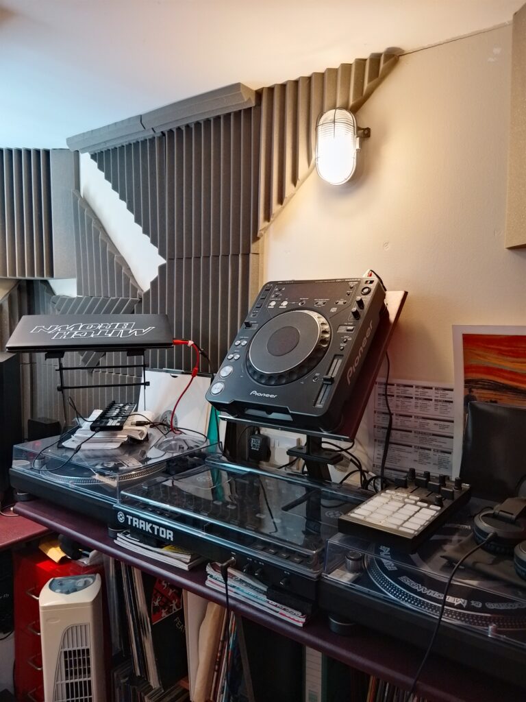 Technics SL1210 MK2 deck X 2Behringer VMX200 DJ MixerM-Audio Torq – Connectiv running on old laptop PC